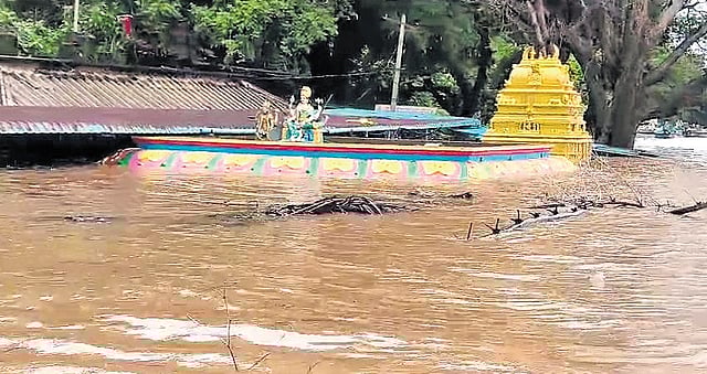 The Gandi Pochamma temple was totally submerged on Saturday. Only the temple Sikharam was visible.