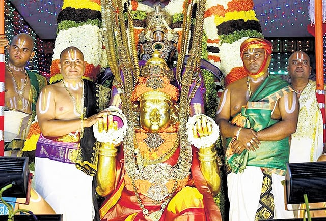 TIRUMALA: On day five of the Srivari Brahmotsavams, a sea of devotees thronged the galleries of the Srivari temple and Mada streets in Tirumala to get a glimpse of Lord Venkateswara on the Garuda Vahanam.