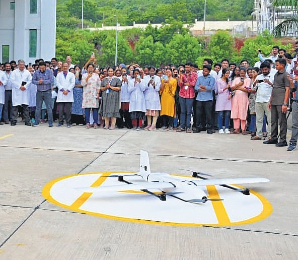 VIJAYAWADA: All India Institute of Medical Sciences (AIIMS) Mangalagiri has introduced a new drone service to expedite healthcare delivery, marking its inaugural flight with the transport of a blood sample from the Centre for Rural Health (CRHA) in Nutakki to AIIMS Mangalagiri in just nine minutes.