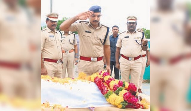 GUNTUR: In a heartwarming gesture, Bapatla Superintendent of Police (SP) Tushar Dudi performed the last rites of a police tracker shadow dog, Foxy, which died due to ill health on Wednesday.