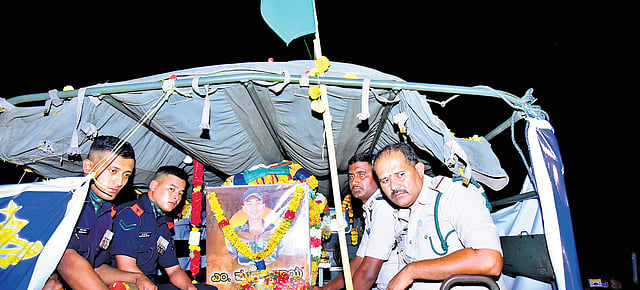 The body reached Bangalore airport around 2 pm, and from there it was taken to his native place by road in a procession. A large number of people participated in the procession. People also congregated at road junctions in large numbers to offer tributes to the martyred Jawan, and it took several hours to reach his native village Kalli Thanda. BC Welfare Minister S Savitha took part in the procession from Bengaluru to his residence.