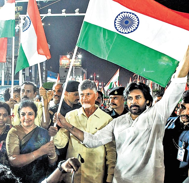 VIJAYAWADA: Chief Minister N Chandrababu Naidu, alongside Deputy Chief Minister Pawan Kalyan, BJP State president Daggubati Purandeswari, ministers, public representatives, and thousands of Vijayawada citizens, led a spirited Tiranga Rally through the city’s main thoroughfare on Friday evening to mark the triumph of Operation Sindoor.