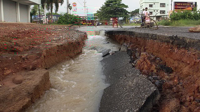 VISAKHAPATNAM: A road cave-in on the Vepagunta–Pinagadi stretch in Visakhapatnam has left commuters struggling with flooding, damaged roads, and poor safety measures.