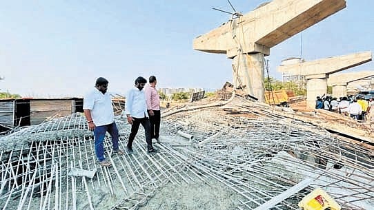 According to preliminary information, the work is being carried out by the R&B Department, with financial support from GVMC and APIIC. The decking of the bridge collapsed between the third and fourth pillars during construction, leading to the accident. As the incident occurred around lunchtime, only a few workers were present at the site, limiting the number of casualties.