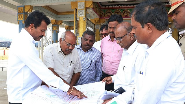 TTD JEO V Veerabrahmam reviewed arrangements with officials, inspecting temporary kitchens, storage sheds, and annadanam facilities. He directed that food counters, seating, and water supply be completed on time, while temple and yagashala renovations be expedited. At the Kalyana Mandapam, officials examined prasadam counters, entry and exit points, and accommodation facilities.