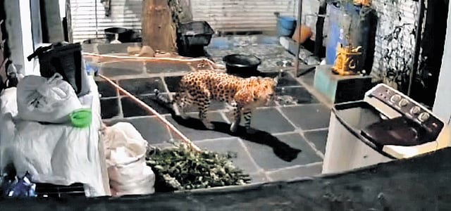 In the early hours of Friday, a leopard strayed into the house of temple priest Satyanarayana Sastri, located along the busy Pathalaganga steps route. The animal’s movement was captured on CCTV cameras, leaving the family shocked when they reviewed the footage in the morning. Family members said the incident could have turned tragic had they slept on the veranda that night.