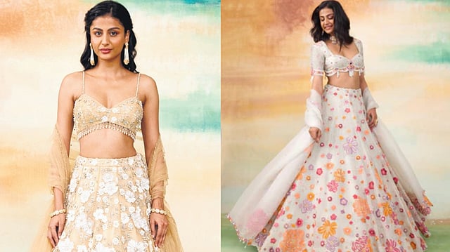 In contrast, the vibrant yellow pieces radiate joy and exuberance, with peplum shararas, choker dupattas, and lightweight suit sets infused with intricate floral accents. “Yellow symbolises optimism and energy, perfect for those who seek to make a bold statement,” Shasha adds.