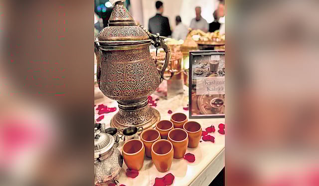 A Samovar — an intricately carved copper kettle to pour Kahwa — adorned the table with tiny copper cups. Beside it, fresh spices from the Valley, from the crisp marooned dried red chillies, and big cloves, and star anise to the fragrant bay leaves and cinnamon ensured we were in for authentic flavours.