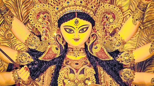 Here, the bylanes are dotted with makeshift stalls selling bright red dupattas with golden gotas that will adorn the idols of the Durga. You see coconuts stacked up to the brim across stores, while the barley grain sits aplenty in baskets.