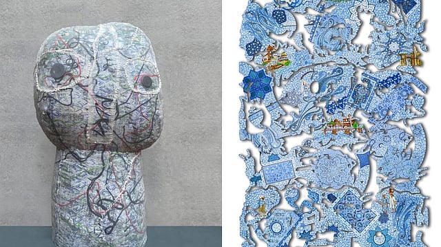 The exhibition also delves into themes of climate change, modernisation, urbanisation, and materialism. Gurjeet Singh’s ‘We Are Losing’ offers a visual commentary on sustainability. Singh uses recycled materials, sourcing misprinted fabrics discarded by shops, to craft his artwork. One of his sculptures ‘We are Losing I’ represents Earth, with colours and textures resembling the planet’s surface. By overlaying the piece with organza for a translucent effect, Singh creates a visually striking mixed-media piece that is both beautiful and meaningful.