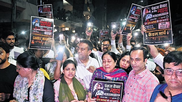 On Tuesday evening, the family members and friends organised a candle march from A-Block, Preet Vihar, to the main road, demanding justice for Pankaj. A large number of local residents participated, calling for swift arrests of the absconding accused.