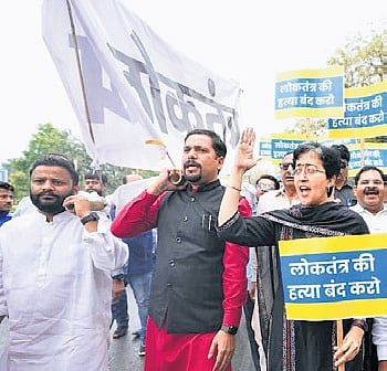 NEW DELHI: AAP legislators boycotted the first day of the Delhi Assembly’s Budget Session on Monday, staging a protest with an “arthi” (bier), alleging “murder” of democracy by the ruling BJP.