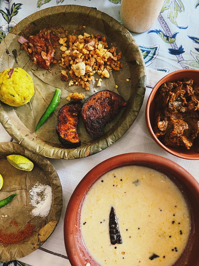 Pakhala, the centrepiece of the afternoon, is not merely a dish in Odisha. It is ritual, memory, and relief from the summer heat, all at once. Fermented rice soaked overnight, finished with torani, spiced yoghurt, and tempered with curry leaves, mustard and red chillies. It arrives cool and comforting. Around it, a generous constellation of accompaniments. There was sesame papad from Berhampur, brittle and nutty, paired with a smoky tomato poda chutney that lingered pleasantly on the palate. Baigana bhaja, aloo chakata, chatu bhaja, saaga badi, and badi chura created a rhythm of textures and flavours that felt both humble and deeply considered. For those who preferred meat, there was macha bhaja and a robust mutton kassa.