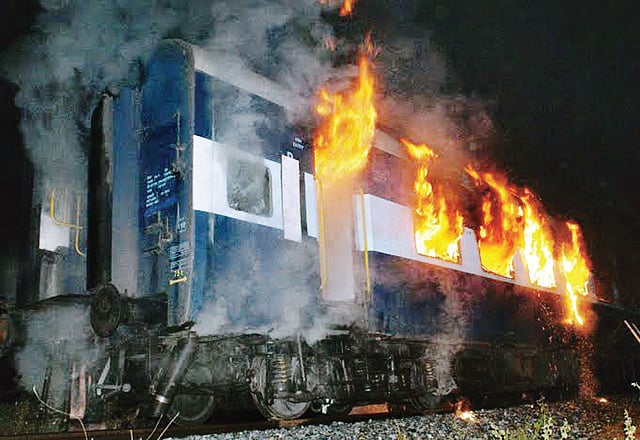 The blood stains of a woman, who jumped from the train on seeing the flames first , stood as an evidence for the police to come to such a conclusion.