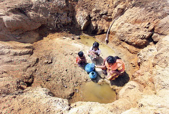 At a lake at Umblebailu, villagers wait for the whole day to get 15-20 pots of water. Umblebailu is situated about 15 km from Shivamogga city. On one side of the village, one can see the Tunga reservoir and on the other, the Bhadra backwaters. Though the village is surrounded by thick forests, borewells have gone dry.