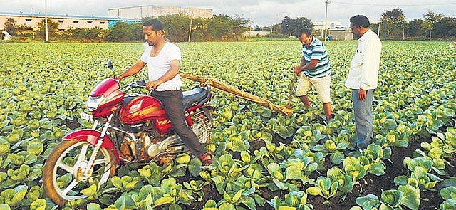 HAVERI: Bucking the practice of using tractors and bullocks in agriculture activities, two siblings use a motorcycle to remove weeds in their cabbage farm in Byadgi of Haveri district. With their father Basavaraj Negalur, a farmer, facing a shortage of labourers to work on his two-acre field, the sons decided to take up this innovation. Under the guidance of Negalur, Nagaraj and Manjunath attached a plough to their motorcycle and got on to the job. They overcame initial hiccups to successfully clear the two-acre land of all weeds. Now, they also use the vehicle to sow seeds.