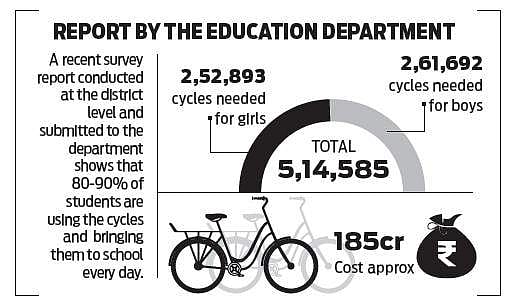 This year, the department finalised four companies. The total cost estimated to distribute free bicycles is `185 crore, to students studying in class 8 of state government and aided schools across the state, excluding those at urban areas and staying in government hostels.As per the data available from the department, for the 2018-19 academic year, the total number of cycles needed is 5,14, 585, of which 2,52,893 are for girls and 2,61,692 for boys.