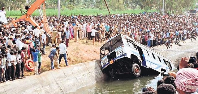 However, the driver, identified as Mahadeva alias Shivappa of Mallanayakanakatte, is still at large two days after the incident. The duo had allegedly leapt out of the bus just before it fell into the canal. Sources said the conductor, identified as Thandava, was picked up from his in-laws’ place on Sunday night and is being interrogated at an undisclosed location.