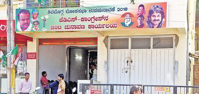 Raghavendra’s campaign has been far more active than the combined campaign for the JD(S)-Congress candidate Madhu Bangarappa despite the parties setting up a common working office for the bypolls.