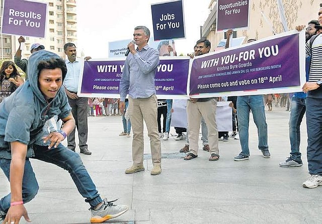 BENGALURU: Roadshows, door-to-door visits, public rallies and long speeches may all seem passe when compared to the Congress-JD(S) alliance candidate for Bangalore North Lok Sabha seat Krishna Byre Gowda’s latest campaign tool. Putting the fun into his poll gig, the 46-year-old five-time MLA resorted to a flash mob — the first of its kind — to seek votes. A group of 30 dancers and 25 volunteers took hundreds of people at Orion Mall in Rajajinagar, Bengaluru, by surprise when they broke into a dance on a busy Sunday evening.