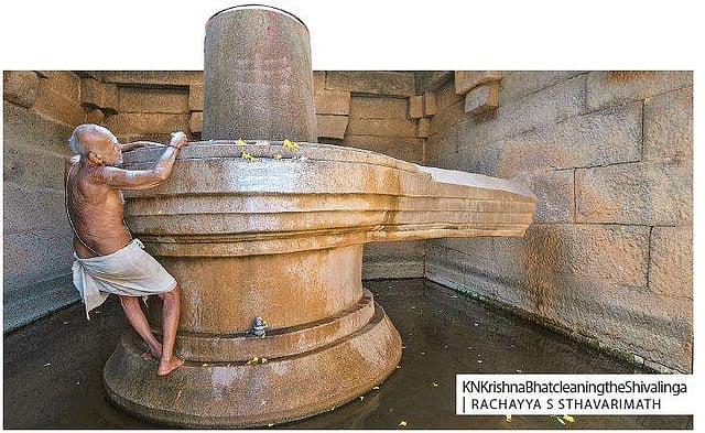 HAMPI: This priest does something unthinkable, every day. He worships Shivalinga and in the process, he steps on it. But no one calls it sacrilege. For 86-year-old K N Krishna Bhat, who has been the priest at the lesser known Badavi Linga temple in the world famous Hampi heritage site for decades, the daily puja is a bit of an adventure. With the three-metre tall monolithic idol dwarfing the pint-sized man, he has no option but to cling to the structure while clearing it of the previous day’s flowers. In the absence of a ladder or scaffolding in the water-logged temple, he steps on the base of the Shivalinga for support. He hangs on to it and applies bhasma (vibhooti) and vermilion to the idol before returning to the doors of the eternally flooded temple. No one objects to the act of the frail, balding priest. In fact, the hunch-backed man’s action draws a lot of eyeballs and cameras.