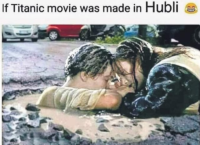 Scene 2: The hero of Titanic, Leonardo Di Caprio is drowning in a water-logged pothole in Hubballi, and Kate Winslet is holding onto him.