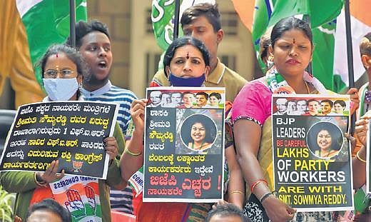 BENGALURU: A day after an FIR was filed against Congress MLA Sowmya Ramalinga Reddy, party leaders and workers on Saturday came out in support of her. State party unit president D K Shivakumar and Leader of Opposition Siddaramaiah have slammed the State government and the Home Department for filing a case against Sowmya.