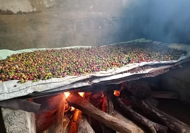 K Vikas, a coffee grower in Makkanduru village has raised a make-shift stove to dry the ripened coffee beans. Coffee beans, which are usually dried under the sun, are now being dried on a wood fire stove. “The bad weather condition has forced us to take this non-traditional method of drying coffee beans,” Vikas explained.