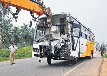 A Bengaluru-bound private bus from Shivamogga collided head-on with a goods carrier laden with vegetables and flowers at 5.30 am. So intense was the crash that bodies of the victims were found stuck inside the vehicle, which required Fire Department personnel to extricate them.
