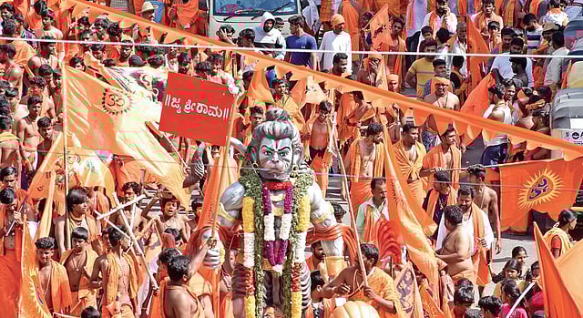 Hanuman devotees took out a Sankeerthana yatra from Hanuman Temple, near Nimishambha Temple. They passed through streets that were decked up for the yatra, and raised slogans, “Ram Mandir in Ayodhya, Hanuman Mandir in Srirangapatna!”