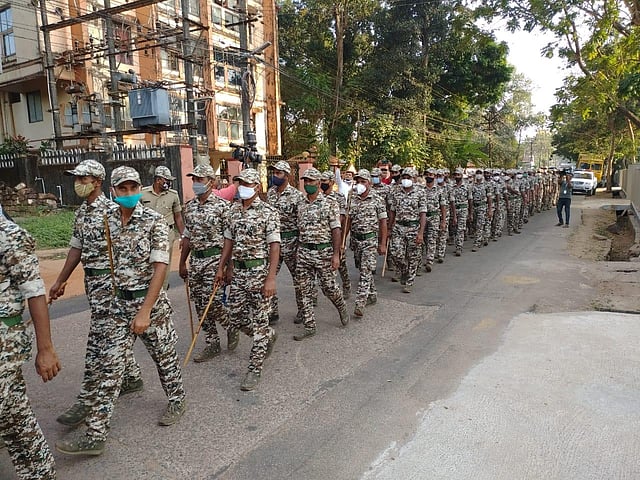 Earlier in the day, a route march was held in the neighboring town of Kaup. The route march was led by Kaup circle police inspector Prakash. About 90 staff of three police stations -- Kaup, Padubidri and Shirva -- under Kaup circle took part in the route march that was taken out for about two-and-a-half km from the town to Polipu Junction and back to Kaup police station. Padubidri sub inspector Ashok Kumar, Shirva SI Shreeshaila, Kaup SI Raghavendra C and DAR staff also took part. A route march was also held at Karkala and Kundapur town.
