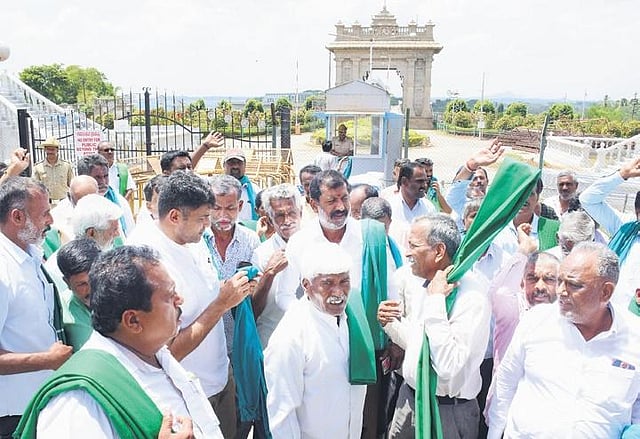 MYSURU: Opposing the release of Cauvery water to Tamil Nadu, farmers, led by Melukote MLA Darshan Puttanaiah, staged a protest in front of KRS dam on Thursday. A large number of farmers gathered in front of the dam and raised slogans against officials and the state government demanding that the release of water be stopped immediately.