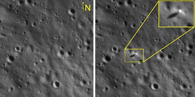 Onboard the orbiter, which has been circling the Moon for the past four years, is the Orbiter High-Resolution Camera (OHRC) with the highest resolution among cameras on any of the orbiters currently operational around the Moon. The photograph shows a small lit object on the Moon, which is the lander Vikram gleaming in the sunlight on the lunar surface at the landing site.