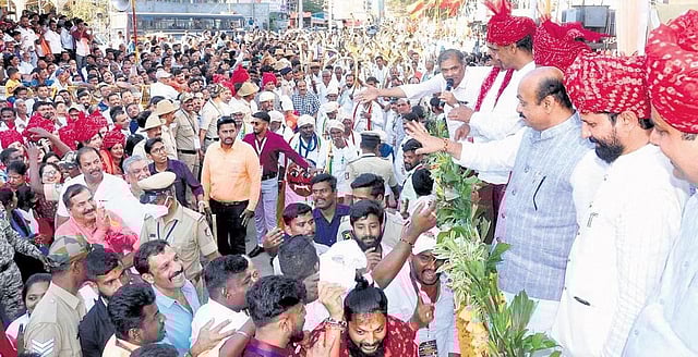 Chief Minister Basavaraj Bomami interacts with people during an event in Shivamogga on Wednesday | Expres