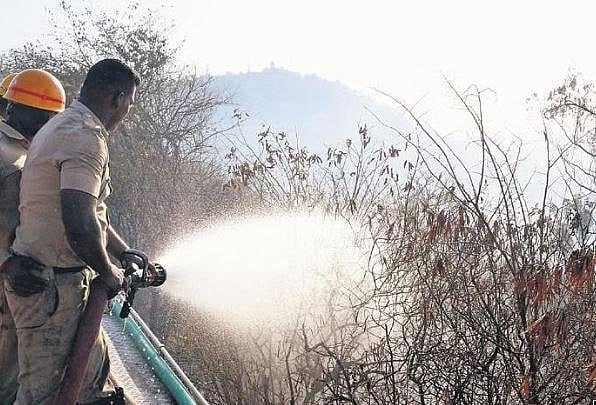 ​ Fire personnel douse flames on Chamundi Hills in Mysuru on Saturday | Udayashankar S ​