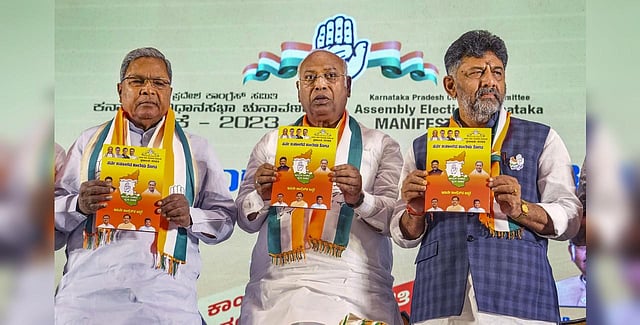 In the manifesto for the polls released here by Congress president Mallikarjun Kharge in the presence of the state unit chief D K Shivakumar and CLP leader Siddaramaiah and others, the party reiterated its five guarantees: Gruha Jyothi, Gruha Lakshmi, Anna Bhagya, Yuva Nidhi and Shakti.
