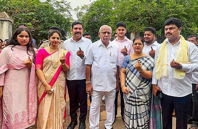 Former CM and senior BJP leader BS Yediyurappa with his family members after casting votes for Karnataka Assembly elections, in Shikaripura, Wednesday. (Photo | PTI)