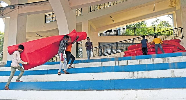BENGALURU: While the Congress high command is yet to finalise the name for the Chief Minister’s post, the preparations to set the stage for the swearing-in ceremony were in full swing at Bengaluru’s Sree Kanteerava Stadium on Wednesday, following a buzz that Siddaramaiah will be taking the oath of office on Thursday.