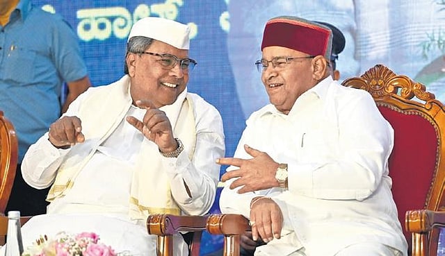 Chief Minister Siddaramaiah and Governor Thaawarchand Gehlot share a light moment at the inauguration of the centenary celebrations of the KAS Officers’ Assocation in Bengaluru on Wednesday | Nagaraja