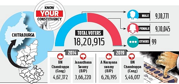 Amidst the Prime Minister Narendra Modi wave in 2014, Congress candidate BN Chandrappa won by a margin of over one lakh votes against Janardhana Swamy. But he lost in 2019 by a margin of 80,178 votes to BJP candidate A Narayanaswamy. This time, he is banking on Congress MLAs who have won Chitradurga, Hosadurga, Hiriyur, Challakere, Molakalmuru, Sira and Pavagada Assembly constituencies, while the party has a sizable presence in Holalkere, where BJP won.