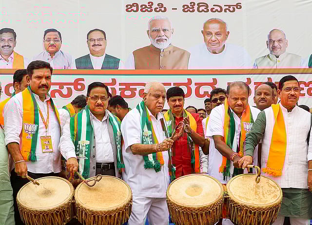BJP State President and MLA B Y Vijayendra, JD(S) State President and Union Minister H D Kumaraswamy, Opposition Leader in Legislative Council Chalavadhi Narayanswamy, JD(S) leader Nikhil Kumaraswamy, also several legislators, leaders and workers from both parties took part as the march began at Bidadi today.