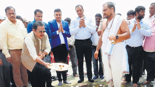 The work began after Vijayanagara district in-charge minister BZ Zameer Ahmad Khan and officials of the TB Board offered puja to the Tungabhadra river.