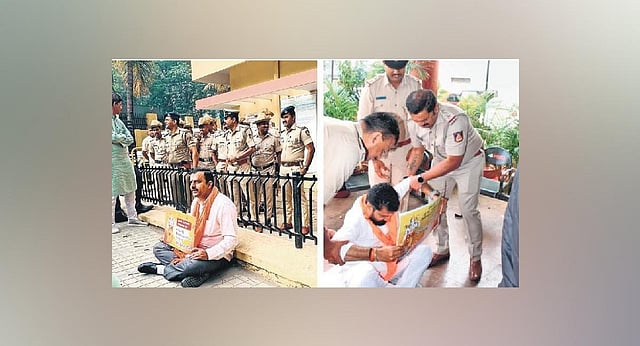 The MLA sat for the protest amid chants of Jai Sri Ram by his followers. Kumar said that the campaign has been launched statewide to condemn the Congress government for intimidating karsevaks and Ram devotees. He also added that Srikant Pujari is being portrayed as a criminal but the Mangaluru cooker bomb accused is labelled innocent.