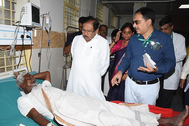 Karnataka Home Minister Dr G Parameshwara visiting the victims at the district general hospital in Tumakuru on Thursday. Photo | Express