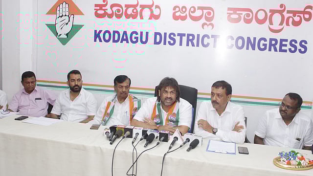 Karnataka education minister Madhu Bangarappa speaking to media at the District Congress Office in Madikeri. Express photo