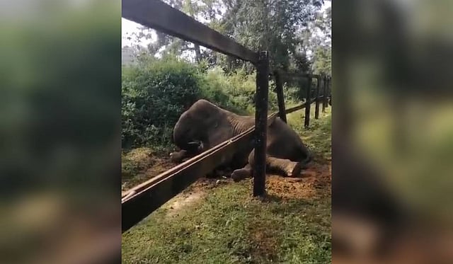 Madikeri: A wild elephant that was stuck between a railway barricade was rescued by the forest department officials. The incident was reported at Valnuru-Tyagathuru limits in Kushalnagar taluk.