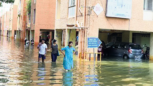 BBMP officials and gang men and personnel from the National Disaster Relief Force and fire department were seen pumping out water from the apartment complex.