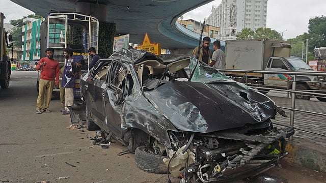 The speeding car crashed into the median on the flyover, collided with a bike coming in the opposite direction and plunged 30 feet from the Yeshwanthpur flyover at 3.50 am on Tuesday. The accident occurred at a sharp curve on the flyover.