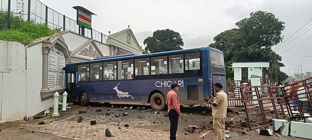 DHARWAD: The Hubballi-Dharwad Bus Rapid Transit System (HDBRTS) ‘Chigari’ bus allegedly jumped out of its corridor yet again on Sunday, ramming into the compound wall of JSS College in Dharwad. The impact broke the wall and the bus entered the college premises, but no injuries were reported.