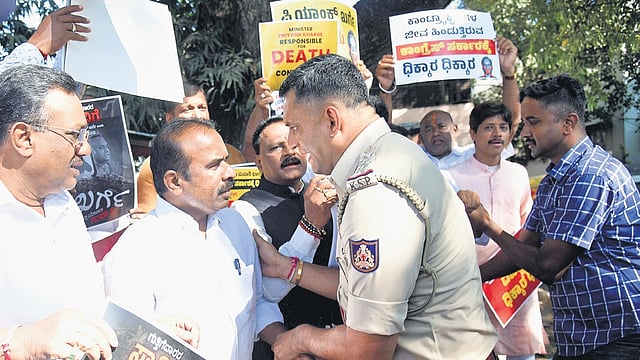 Leader of Opposition in the Legislative Council Chalavadi Narayanswamy and senior BJP leaders pasted posters, accusing the minister of being responsible for contractor Sachin Panchala’s death, and demanded a CBI probe into the case. Bengaluru police detained the BJP leaders while they were staging the protest.